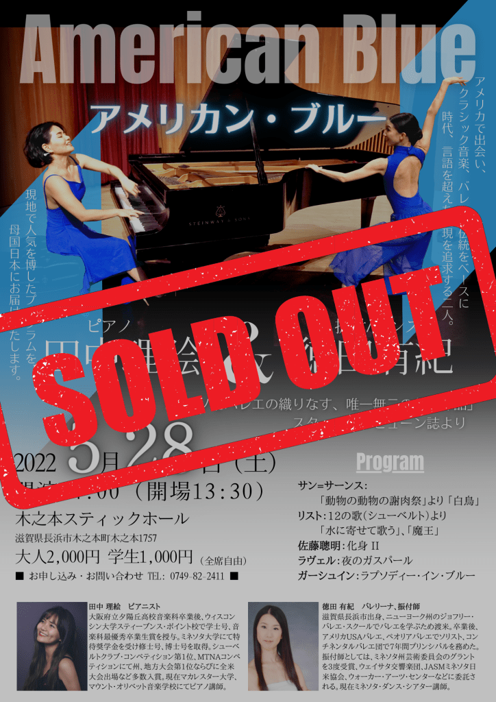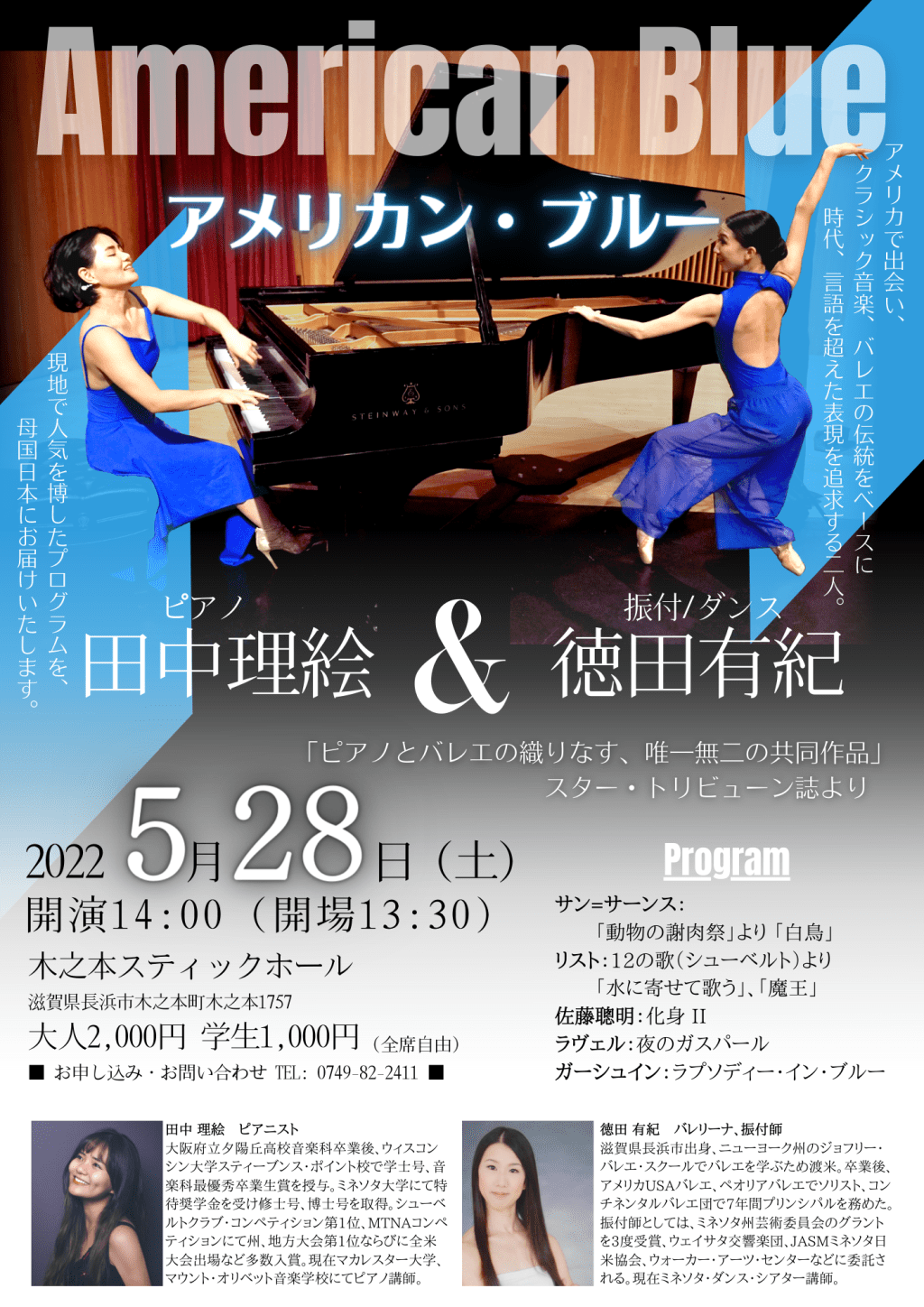 アメリカで活躍するピアニスト田中理絵とバレエダンサー徳田有紀の待望の日本公演が決定いたしました。現地で人気を博したプログラムを2人の地元にお届けいたします。
