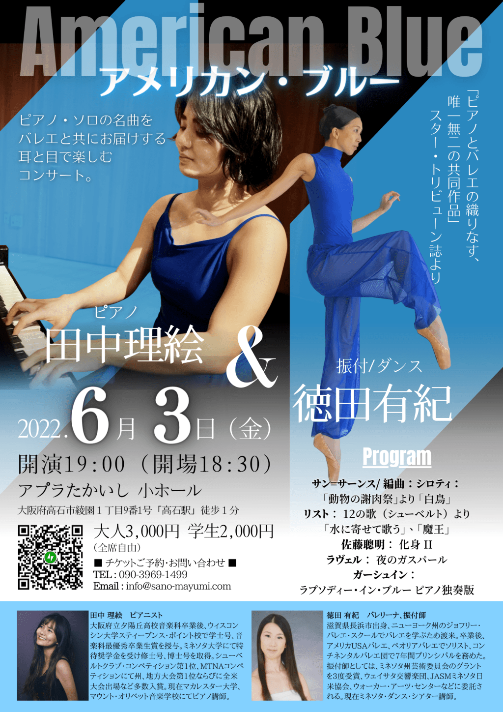 アメリカで活躍するピアニスト田中理絵とバレエダンサー徳田有紀の待望の日本公演が決定いたしました。現地で人気を博したプログラムを2人の地元にお届けいたします。